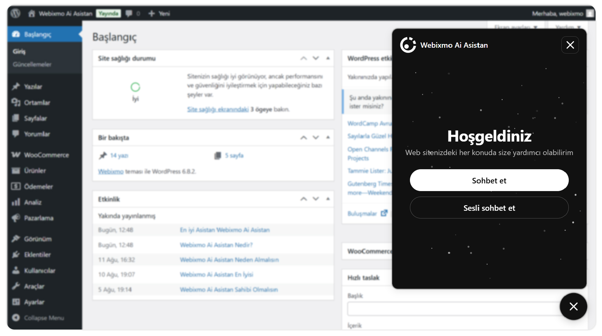 Artık siteni yönetmek için saatlerce uğraşmana gerek yok! WordPress sohbet asistanın sayesinde içerik oluşturmaktan ürün eklemeye, sesli komutla yönetmeye kadar her şeyi senin yerine halleder. Sen sadece ne istediğini söyle, gerisini asistanın saniyeler içinde yapsın. Hızlı, pratik ve eğlenceli bir site yönetim deneyimine hazır mısın?